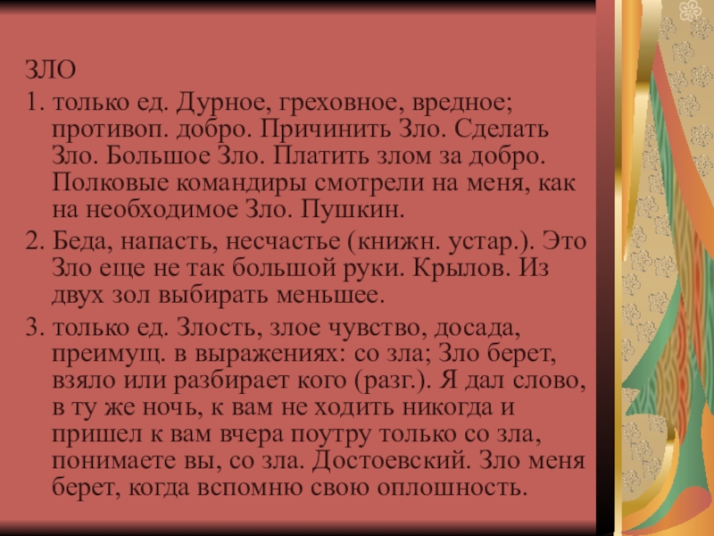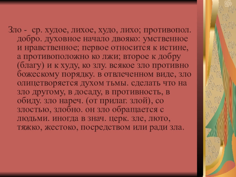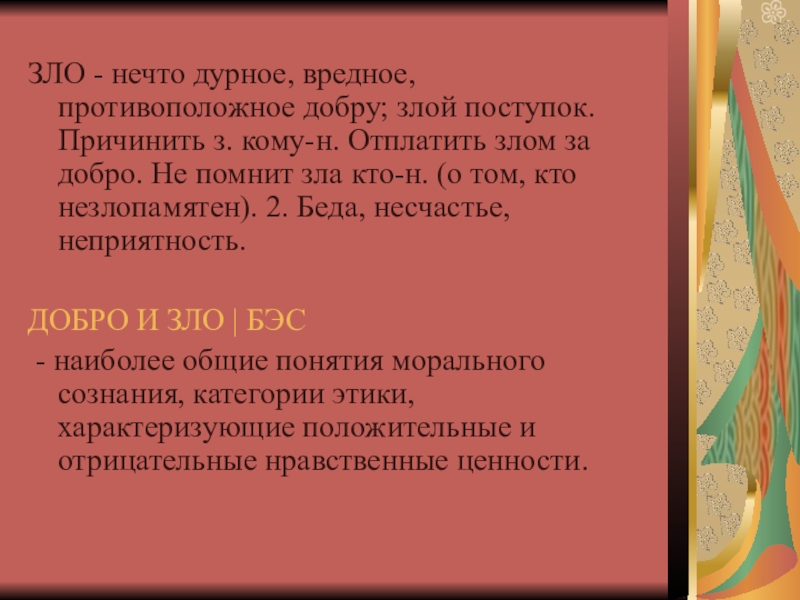 Слайд 11ЗЛО - нечто дурное, вредное, противоположное добру; злой поступок. Причинить з.