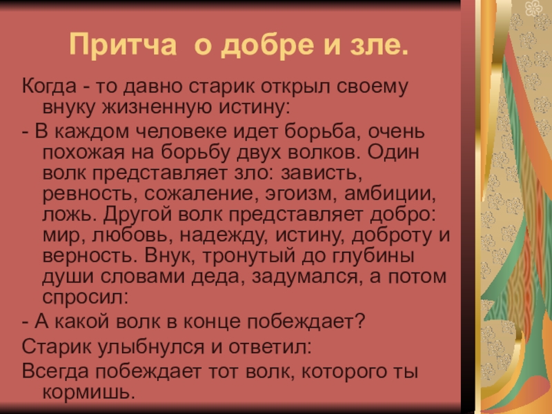Слайд 4Притча о добре и зле.