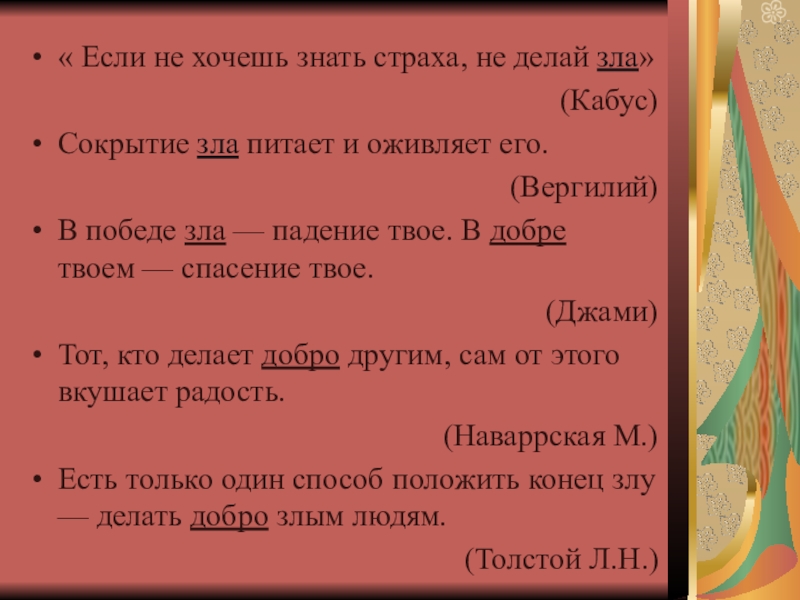 Слайд 17« Если не хочешь знать страха, не делай зла»