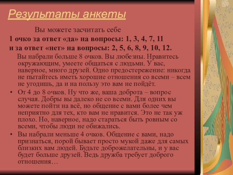 Вы набрали больше 8 очков. Вы любезны. Нравитесь окружающим, умеете общаться с людьми. У вас, наверное, много друзей. Одно предостережение: никогда не пытайтесь иметь хорошие отношения со всеми – всем не угодишь, да и на пользу это вам не пойдёт.