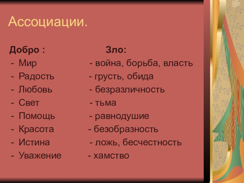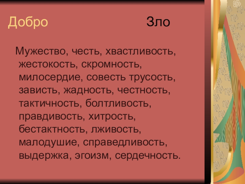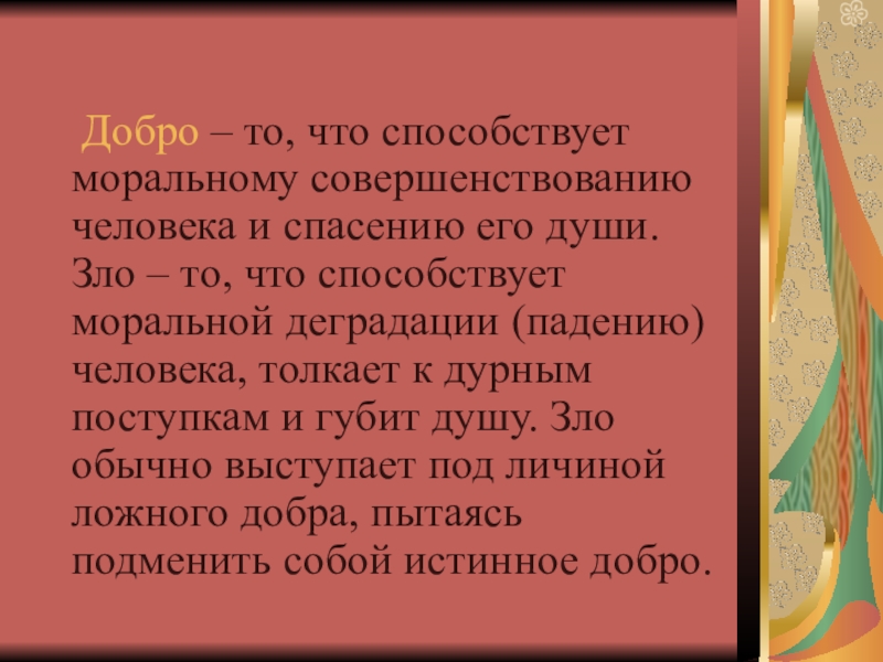 Зло – то, что способствует моральной деградации (падению) человека, толкает к дурным поступкам и губит душу. Зло обычно выступает под личиной ложного добра, пытаясь подменить собой истинное добро.