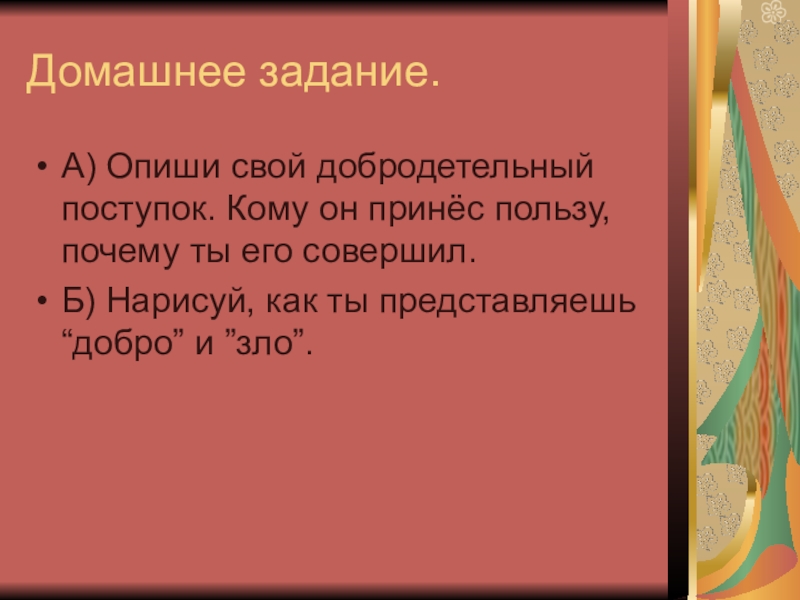 А) Опиши свой добродетельный поступок. Кому он принёс пользу, почему