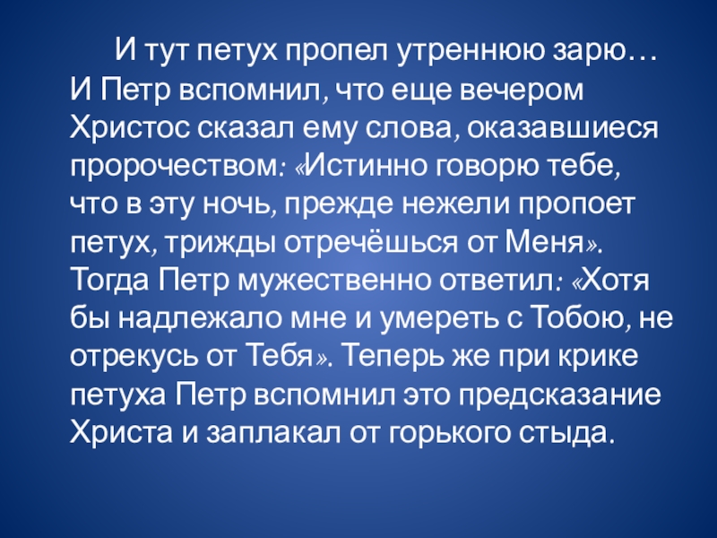 вечером Христос сказал ему слова, оказавшиеся пророчеством: «Истинно говорю тебе, что в эту ночь, прежде нежели пропоет петух, трижды отречёшься от Меня». Тогда Петр мужественно ответил: «Хотя бы надлежало мне и умереть с Тобою, не отрекусь от Тебя». Теперь же при крике петуха Петр вспомнил это предсказание Христа и заплакал от горького стыда.