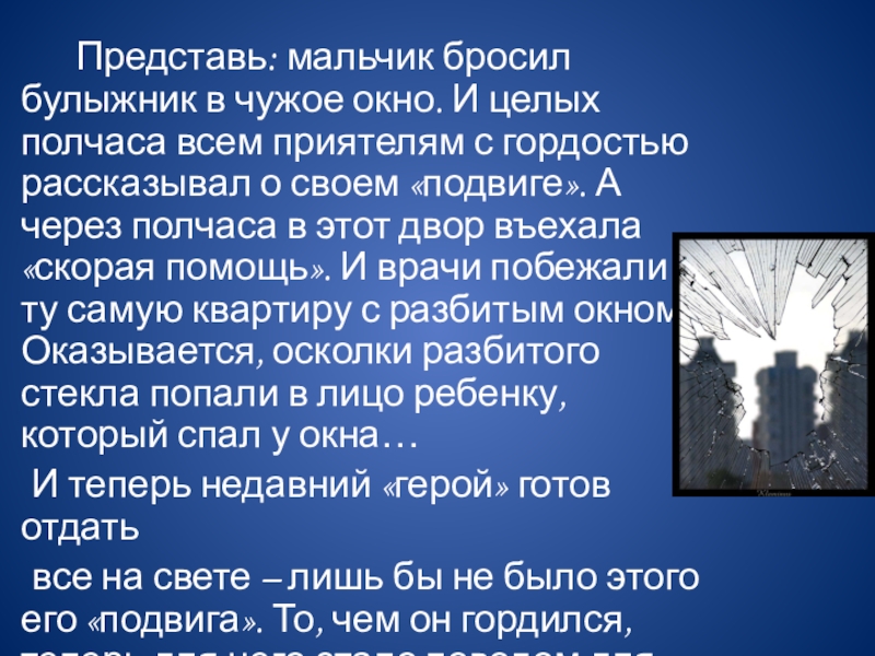 Слайд 19 Представь: мальчик бросил булыжник в чужое окно. И целых полчаса всем