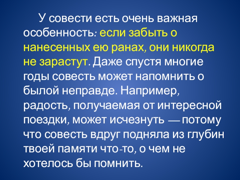 Слайд 12 У совести есть очень важная особенность: если забыть о нанесенных ею