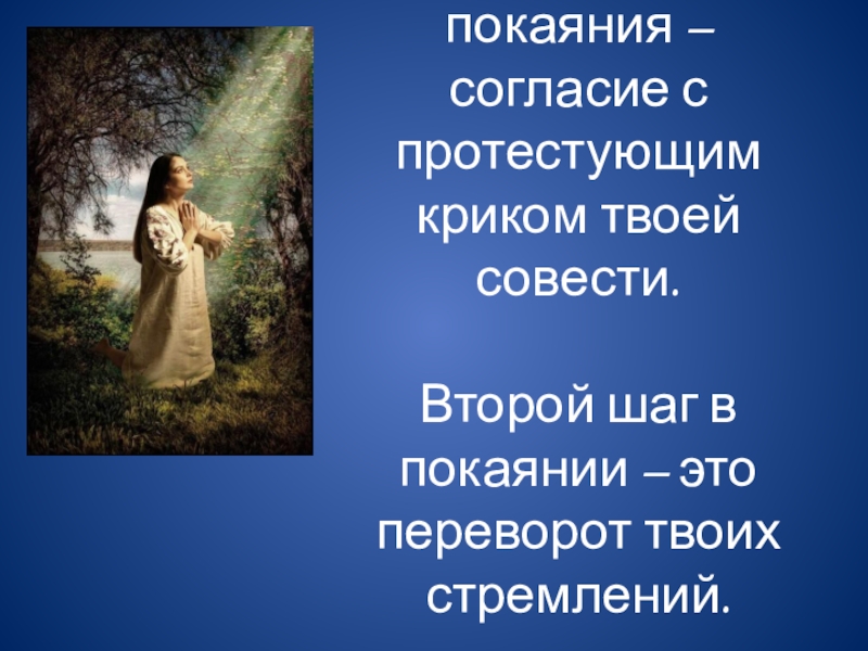 Слайд 17Первый шаг покаяния – согласие с протестующим криком твоей совести.