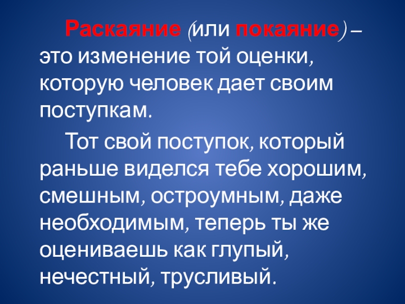 Слайд 16 Раскаяние (или покаяние) – это изменение той оценки, которую человек дает