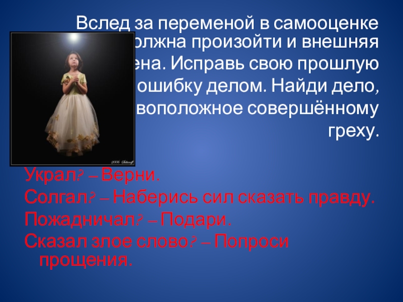 Слайд 20 Вслед за переменой в самооценке должна произойти и внешняя