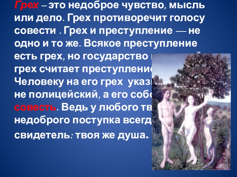 Слайд 5Грех – это недоброе чувство, мысль или дело. Грех противоречит голосу
