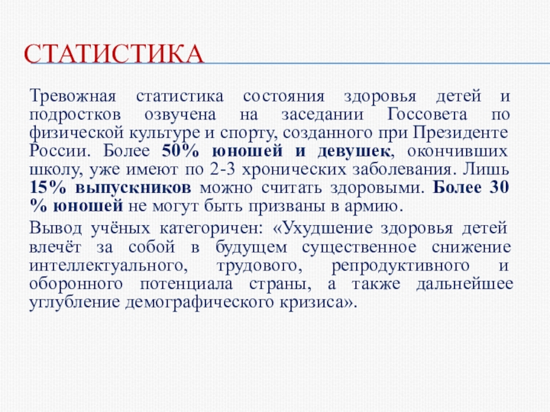 по физической культуре и спорту, созданного при Президенте России. Более 50% юношей и девушек, окончивших школу, уже имеют по 2-3 хронических заболевания. Лишь 15% выпускников можно считать здоровыми. Более 30 % юношей не могут быть призваны в армию.