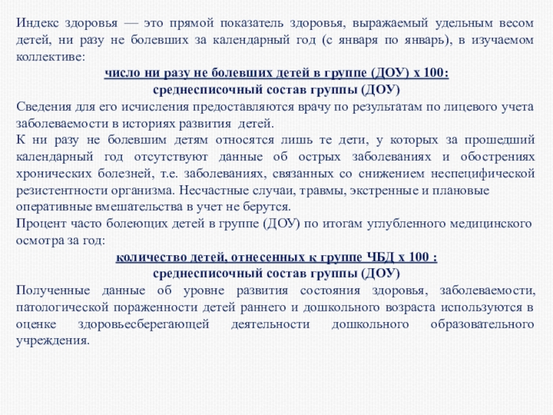 Первая группа — здоровые дети, у которых отсутствуют хронические заболевания; дети, не болевшие или редко болевшие за период наблюдения и имеющие нормальное, соответствующее возрасту физическое и нервно-психическое развитие (здоровые без отклонений).