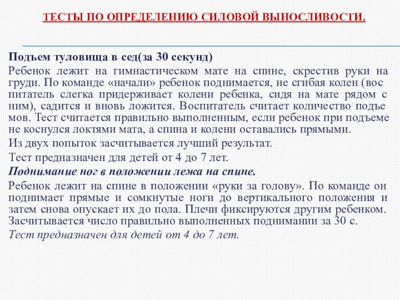 Слайд 31ТЕСТЫ ПО ОПРЕДЕЛЕНИЮ СИЛОВОЙ ВЫНОСЛИВОСТИ.