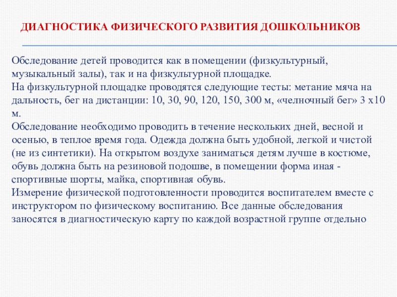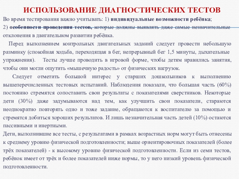Тест проводится с небольшой подгруппой (5 — 7 человек), сформированной с учетом уровня двигательной активности детей. Участвуют два воспитателя и медсестра, которая следит за самочувствием детей.