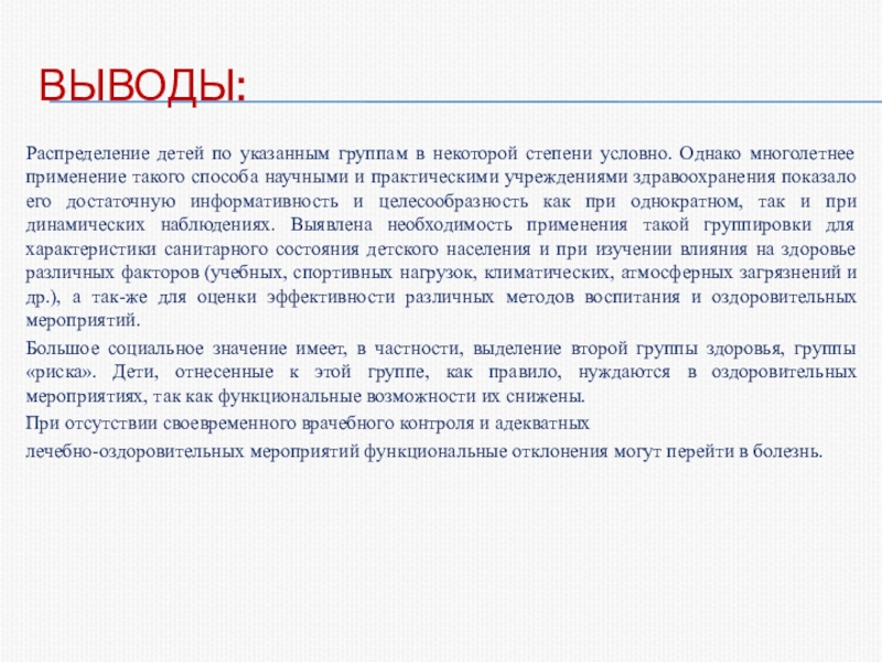 Большое социальное значение имеет, в частности, выделение второй группы здоровья, группы «риска». Дети, отнесенные к этой группе, как правило, нуждаются в оздоровительных мероприятиях, так как функциональные возможности их снижены.
