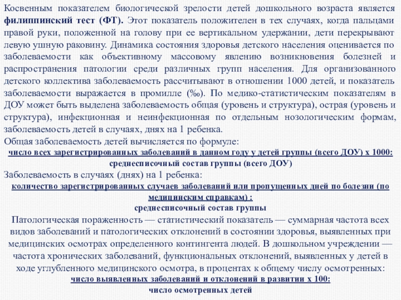 Слайд 17Косвенным показателем биологической зрелости детей дошкольного возраста является филиппинский тест (ФТ).