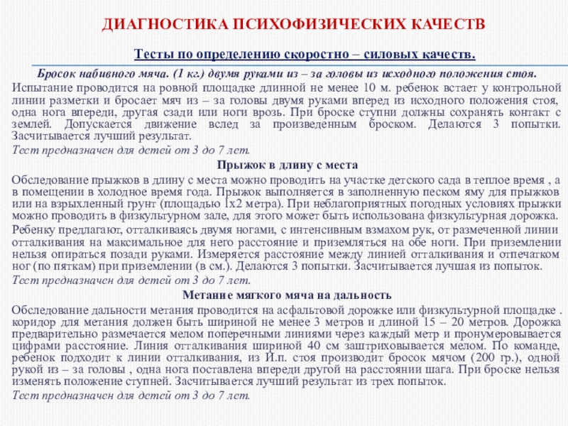 Испытание проводится на ровной площадке длинной не менее 10 м. ребенок встает у контрольной линии разметки и бросает мяч из – за головы двумя руками вперед из исходного положения стоя, одна нога впереди, другая сзади или ноги врозь. При броске ступни должны сохранять контакт с землей. Допускается движение вслед за произведенным броском. Делаются 3 попытки. Засчитывается лучший результат.