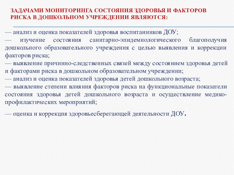 Слайд 8ЗАДАЧАМИ МОНИТОРИНГА СОСТОЯНИЯ ЗДОРОВЬЯ И ФАКТОРОВ РИСКА В ДОШКОЛЬНОМ УЧРЕЖДЕНИИ ЯВЛЯЮТСЯ: