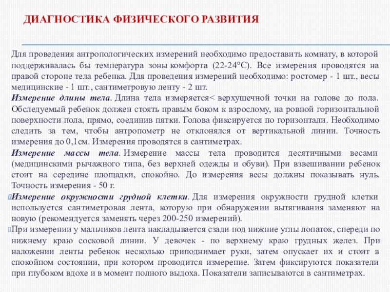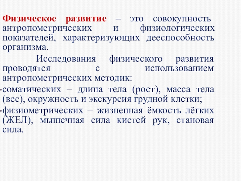 соматических – длина тела (рост), масса тела (вес), окружность и экскурсия грудной клетки;
