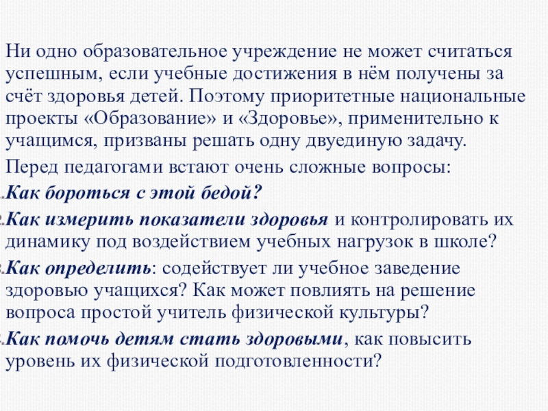 в нём получены за счёт здоровья детей. Поэтому приоритетные национальные проекты «Образование» и «Здоровье», применительно к учащимся, призваны решать одну двуединую задачу.