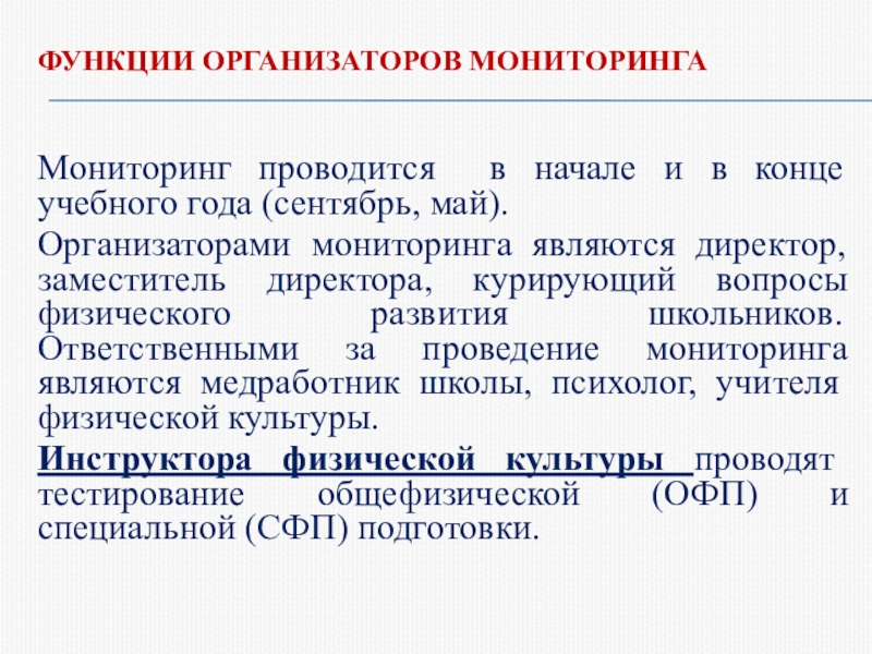 Мониторинг представляет собой систему мероприятий по наблюдению, сбору, хранению, систематизации данных наблюдения, анализу, оценке и прогнозу физической подготовленности и физического развития обучающихся общеобразовательных учреждений.