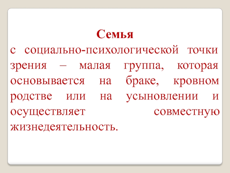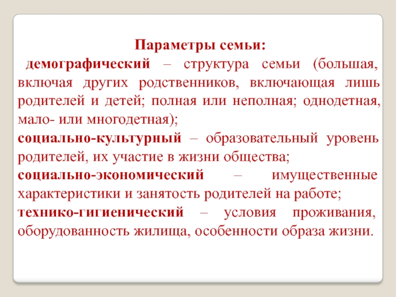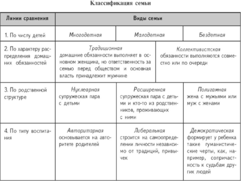 лишь родителей и детей; полная или неполная; однодетная, мало- или многодетная);