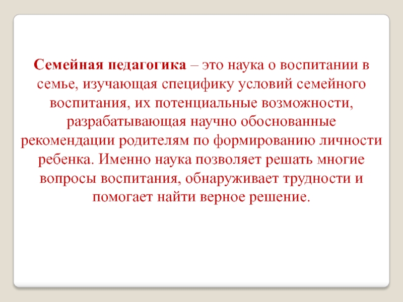 семейного воспитания, их потенциальные возможности, разрабатывающая научно обоснованные рекомендации родителям по формированию личности ребенка. Именно наука позволяет решать многие вопросы воспитания, обнаруживает трудности и помогает найти верное решение.