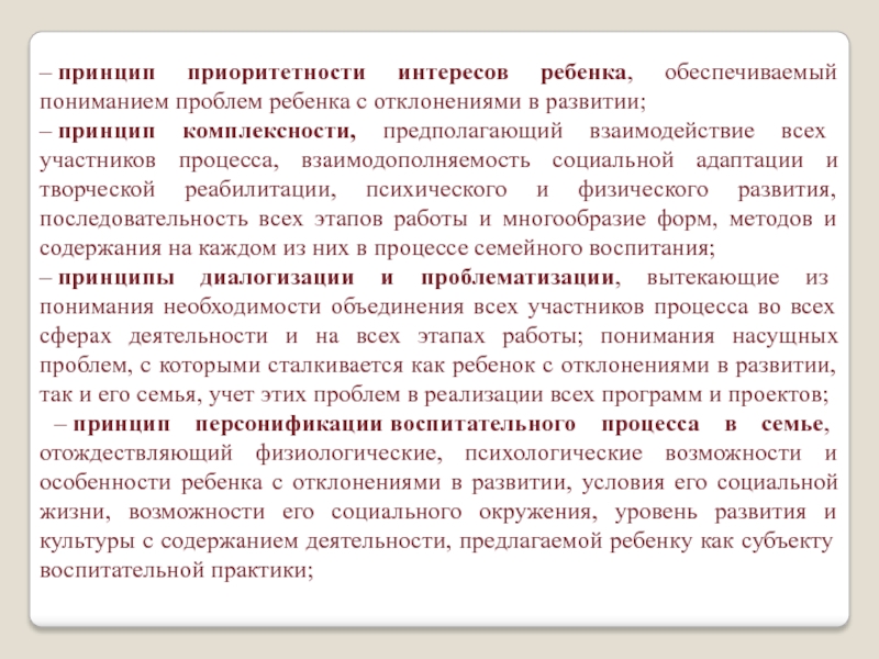 – принцип персонификации воспитательного процесса в семье, отождествляющий физиологические, психологические возможности и особенности ребенка с отклонениями в развитии, условия его социальной жизни, возможности его социального окружения, уровень развития и культуры с содержанием деятельности, предлагаемой ребенку как субъекту воспитательной практики;