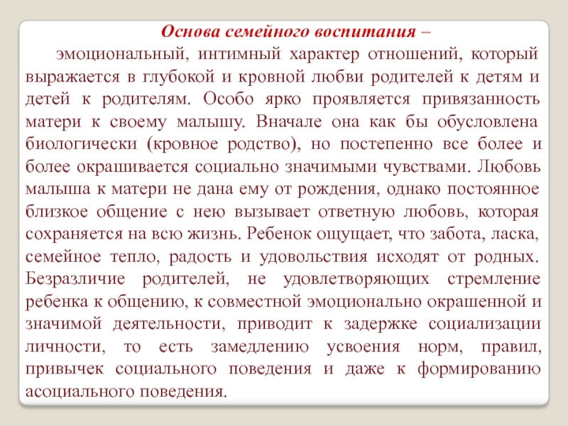 который выражается в глубокой и кровной любви родителей к детям и детей к родителям. Особо ярко проявляется привязанность матери к своему малышу. Вначале она как бы обусловлена биологически (кровное родство), но постепенно все более и более окрашивается социально значимыми чувствами. Любовь малыша к матери не дана ему от рождения, однако постоянное близкое общение с нею вызывает ответную любовь, которая сохраняется на всю жизнь. Ребенок ощущает, что забота, ласка, семейное тепло, радость и удовольствия исходят от родных. Безразличие родителей, не удовлетворяющих стремление ребенка к общению, к совместной эмоционально окрашенной и значимой деятельности, приводит к задержке социализации личности, то есть замедлению усвоения норм, правил, привычек социального поведения и даже к формированию асоциального поведения.