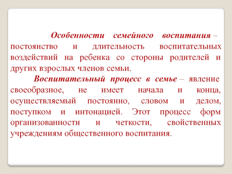 Воспитательный процесс в семье – явление своеобразное, не имеет начала и конца, осуществляемый постоянно, словом и делом, поступком и интонацией. Этот процесс форм организованности и четкости, свойственных учреждениям общественного воспитания.