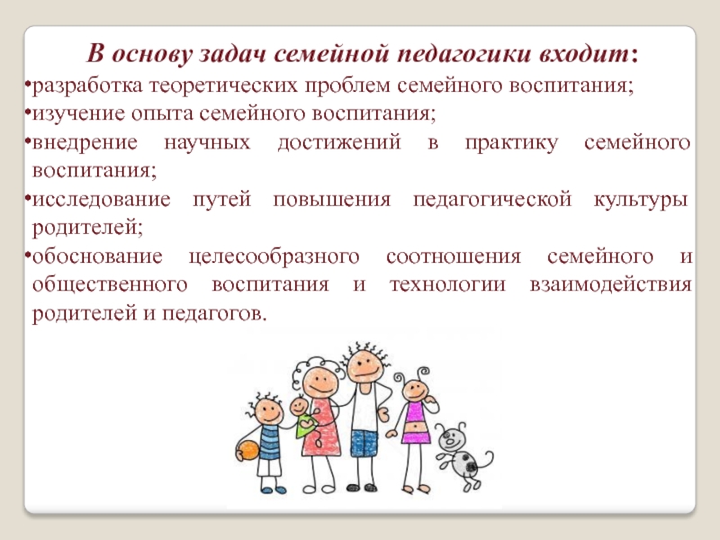 Задачи семейного воспитания: создание максимальные условия для роста и развития ребенка; передача опыта создания и сохранения семьи, воспитания в ней детей и отношение к старшим; научить детей полезным прикладным навыкам и умениям, направленным на самообслуживание и помощь близким.