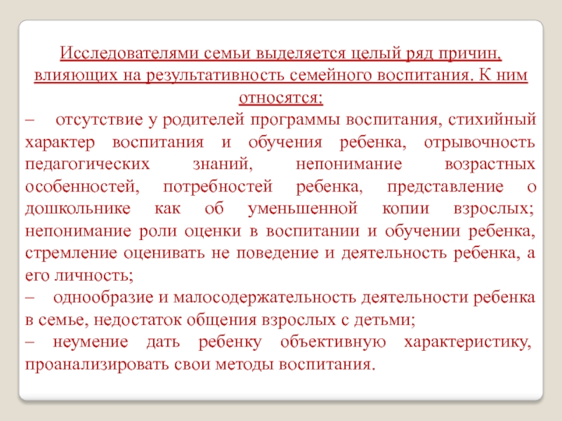 Слайд 23Исследователями семьи выделяется целый ряд причин, влияющих на результативность семейного воспитания.