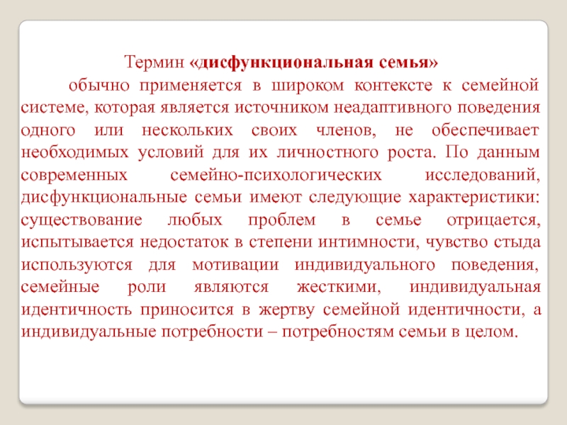 к семейной системе, которая является источником неадаптивного поведения одного или нескольких своих членов, не обеспечивает необходимых условий для их личностного роста. По данным современных семейно-психологических исследований, дисфункциональные семьи имеют следующие характеристики: существование любых проблем в семье отрицается, испытывается недостаток в степени интимности, чувство стыда используются для мотивации индивидуального поведения, семейные роли являются жесткими, индивидуальная идентичность приносится в жертву семейной идентичности, а индивидуальные потребности – потребностям семьи в целом.