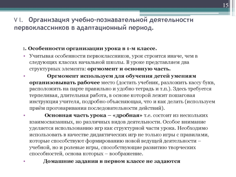 Слайд 15V l. Организация учебно-познавательной деятельности первоклассников в адаптационный период.