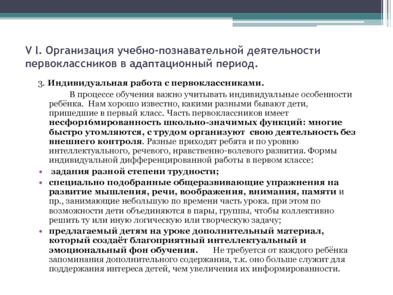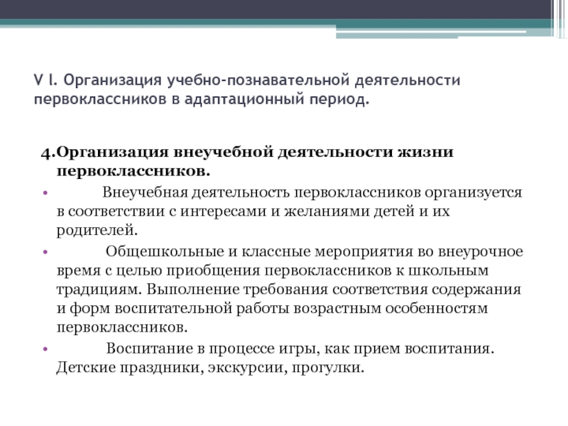 Слайд 18V l. Организация учебно-познавательной деятельности первоклассников в адаптационный период.