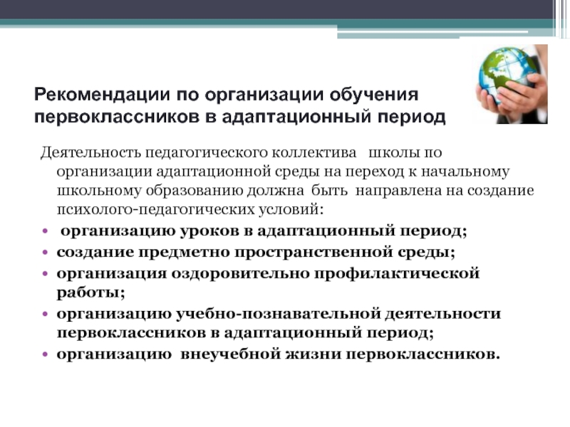 Слайд 3Рекомендации по организации обучения первоклассников в адаптационный период
