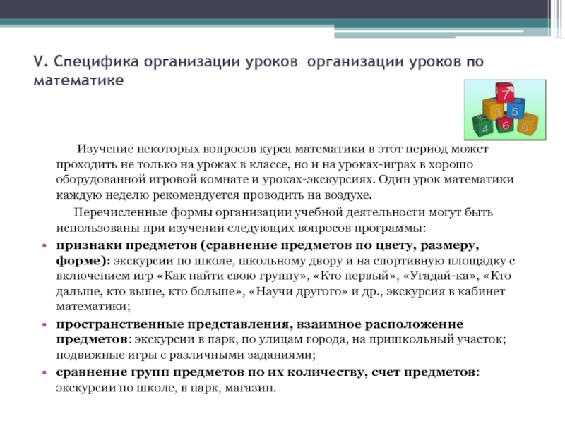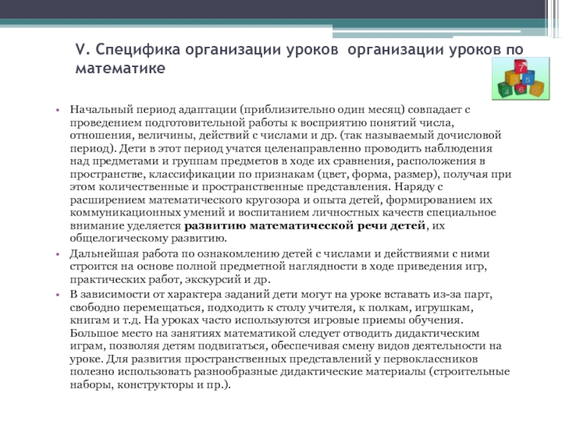 Слайд 11V. Специфика организации уроков организации уроков по математике