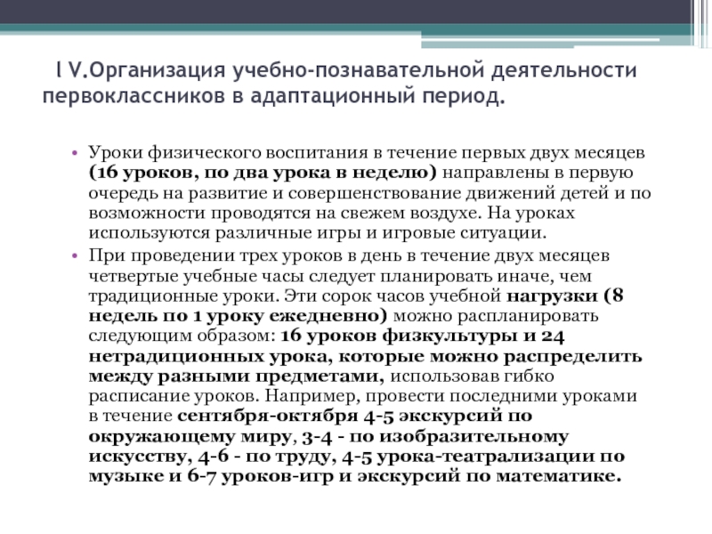 Слайд 10 l V.Организация учебно-познавательной деятельности первоклассников в адаптационный период.