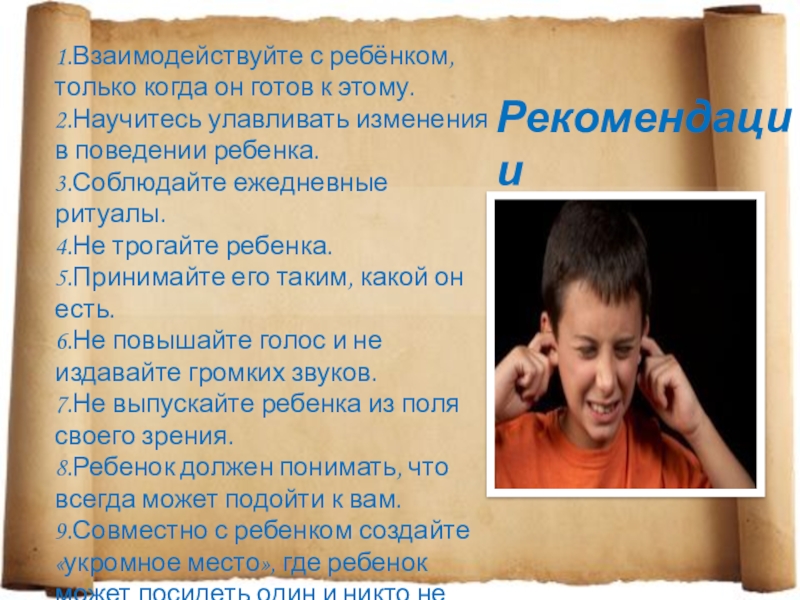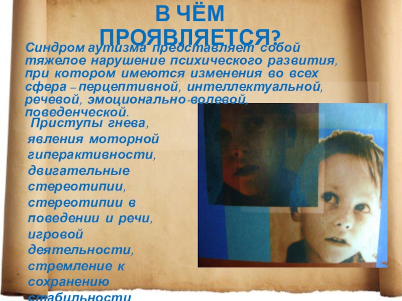 Приступы гнева, явления моторной гиперактивности, двигательные стереотипии, стереотипии в поведении и речи, игровой деятельности, стремление к сохранению стабильности окружающей среды и распорядка, свойственны всем детям с аутизмом