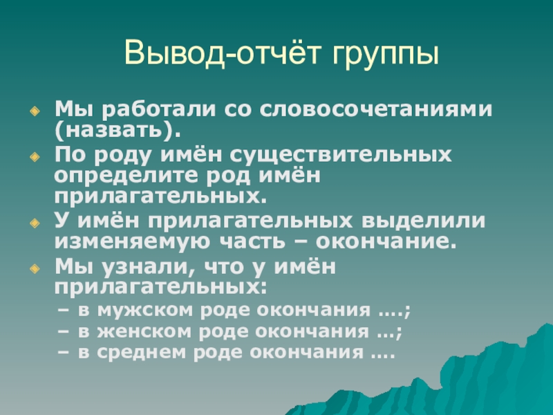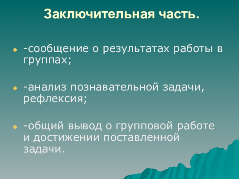 -общий вывод о групповой работе и достижении поставленной задачи.