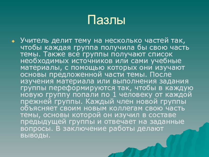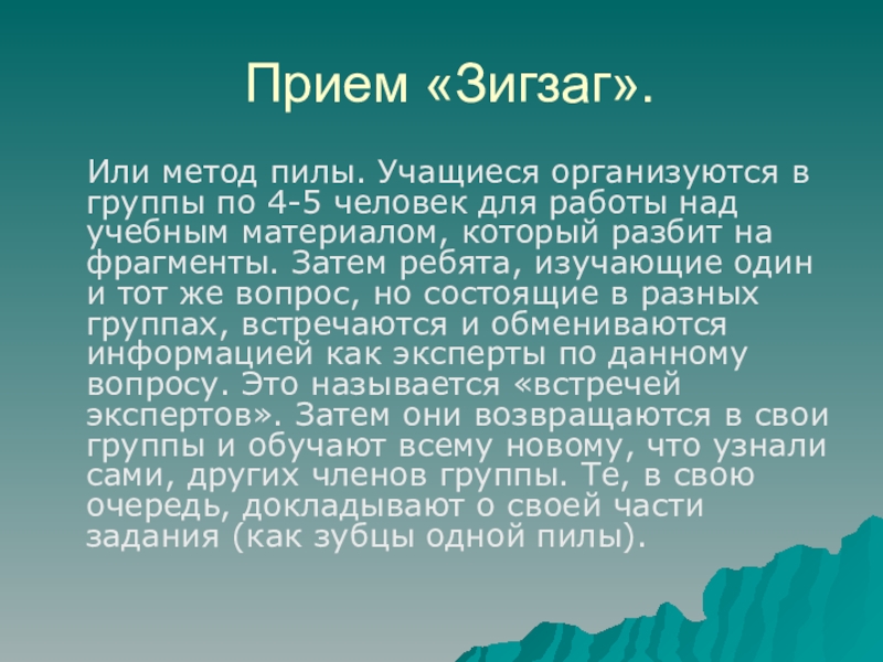 4-5 человек для работы над учебным материалом, который разбит на фрагменты. Затем ребята, изучающие один и тот же вопрос, но состоящие в разных группах, встречаются и обмениваются информацией как эксперты по данному вопросу. Это называется «встречей экспертов». Затем они возвращаются в свои группы и обучают всему новому, что узнали сами, других членов группы. Те, в свою очередь, докладывают о своей части задания (как зубцы одной пилы).