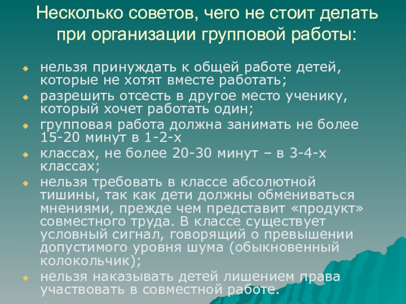 Слайд 5Несколько советов, чего не стоит делать при организации групповой работы: