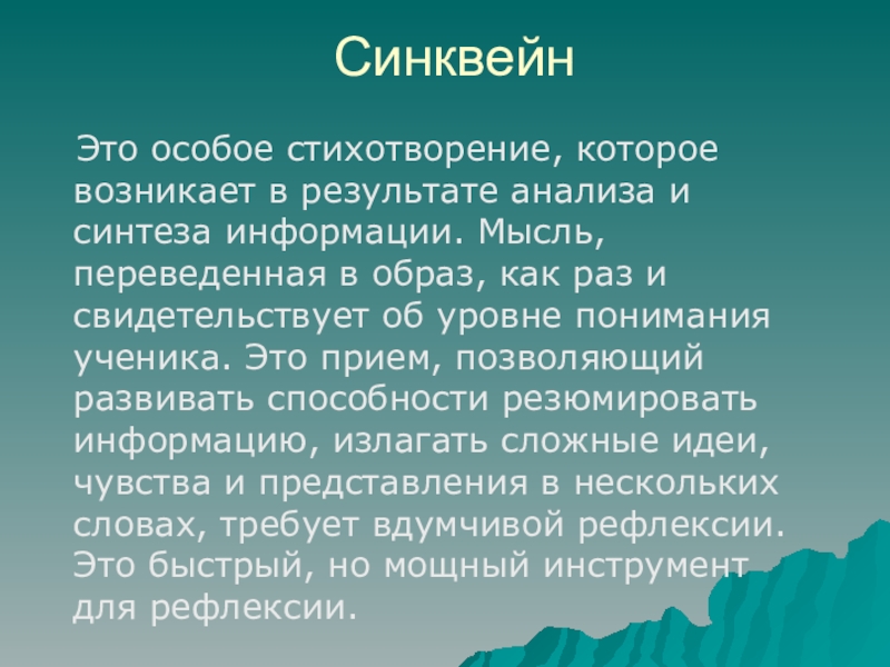 синтеза информации. Мысль, переведенная в образ, как раз и свидетельствует об уровне понимания ученика. Это прием, позволяющий развивать способности резюмировать информацию, излагать сложные идеи, чувства и представления в нескольких словах, требует вдумчивой рефлексии. Это быстрый, но мощный инструмент для рефлексии.