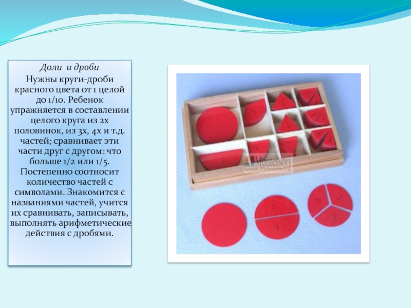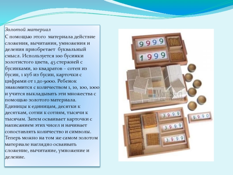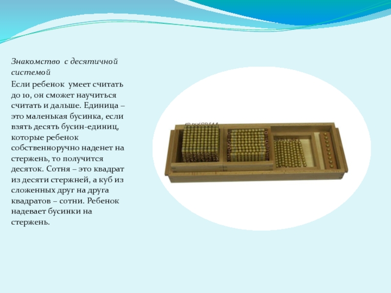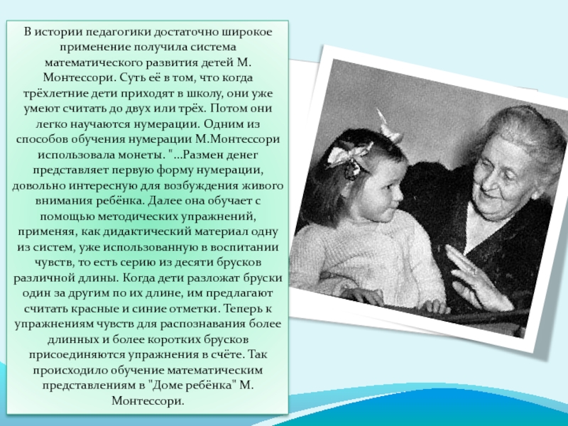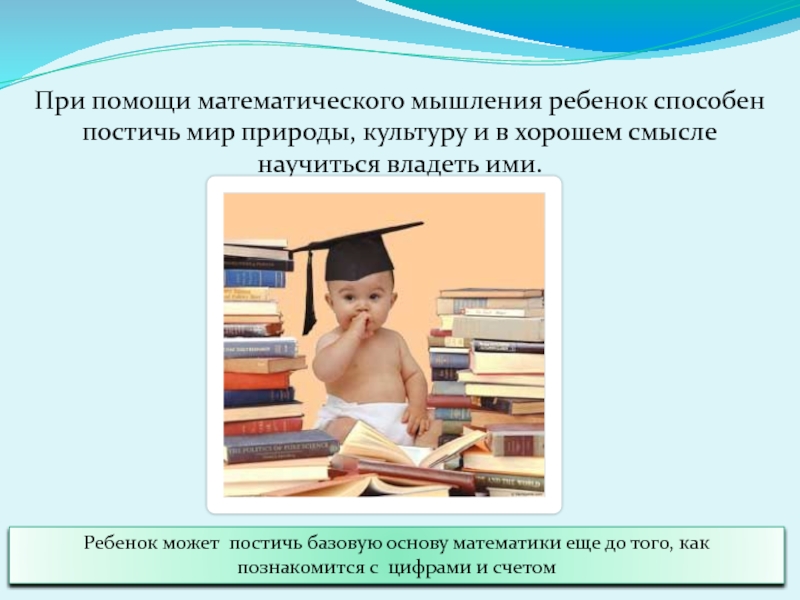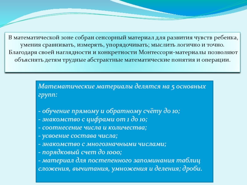 Мария Монтессори называла человеческий ум «математическим умом», подразумевая под этим, что математика не является неким особым сложным явлением, суть которого могут постичь только исключительно одаренные личности, но что она есть нечто присущее человеку, связанное с его жизнью. Заключение сделок, построение последовательностей, классификация – все это проявления математического мышления. Также и ребенок довольно рано и без труда может овладеть математическими знаниями, и математика станет для него такой же близкой и естественной, как речь. Нужно только предоставить ему пищу для развития естественных математических способностей.