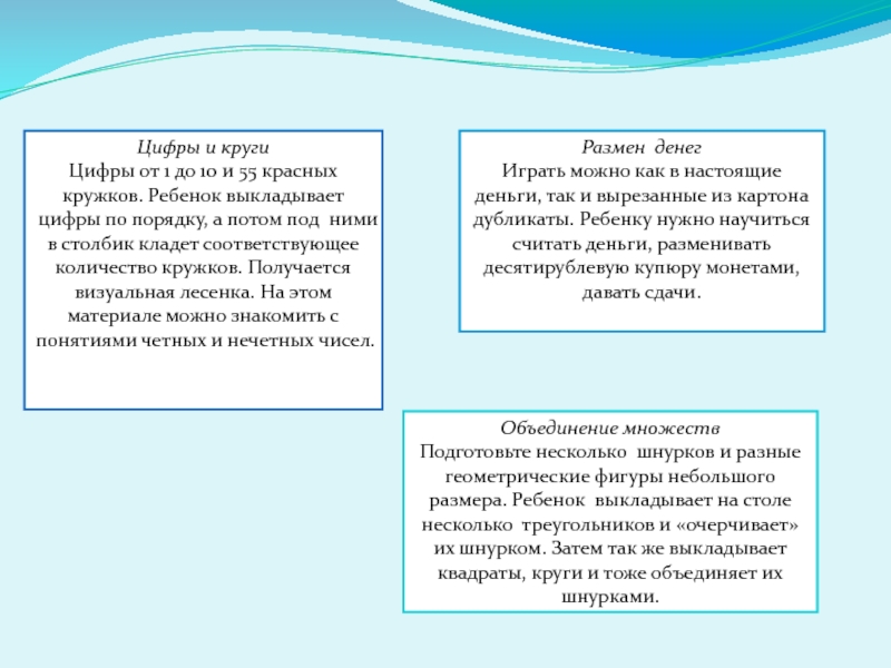 Играть можно как в настоящие деньги, так и вырезанные из картона дубликаты. Ребенку нужно научиться считать деньги, разменивать десятирублевую купюру монетами, давать сдачи.