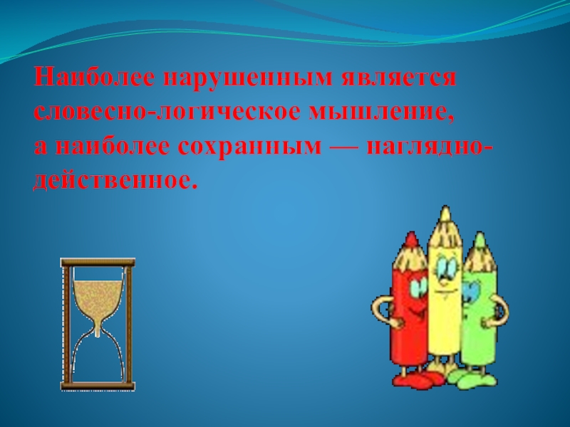 Слайд 7Наиболее нарушенным является словесно-логическое мышление, а наиболее сохранным — наглядно-действенное.