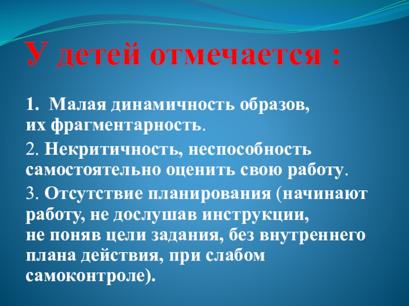 У детей отмечается :1. Малая динамичность образов, их фрагментарность. 2. Некритичность, неспособность самостоятельно оценить свою работу. 3. Отсутствие планирования