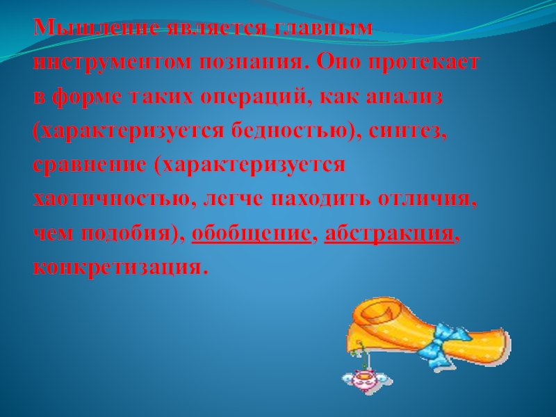 Мышление является главным инструментом познания. Оно протекает в форме таких операций, как анализ (характеризуется бедностью), синтез, сравнение (характеризуется
