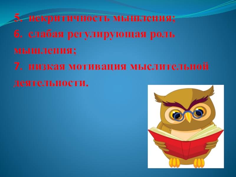 5. некритичность мышления; 6. слабая регулирующая роль мышления; 7. низкая мотивация мыслительной деятельности.