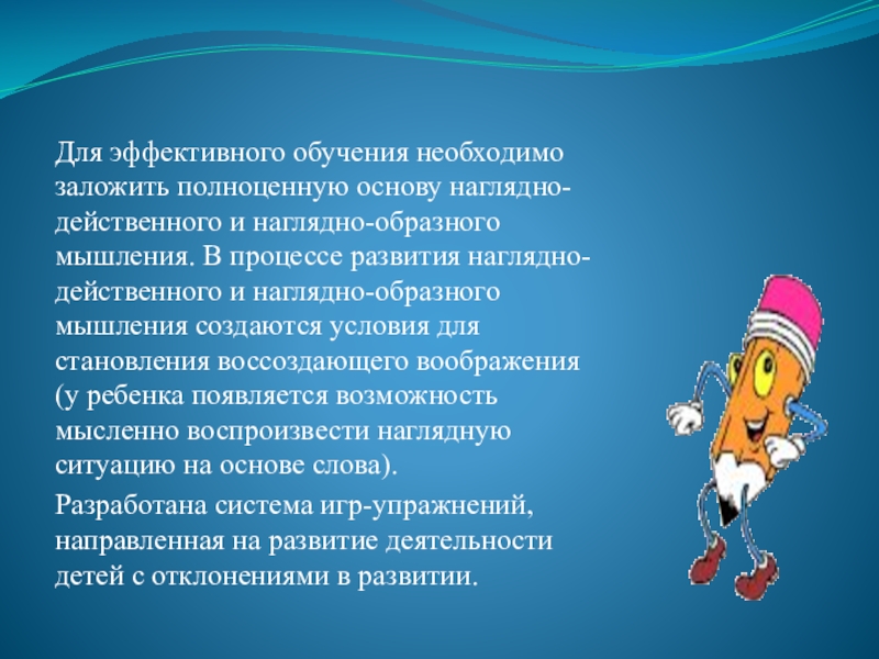 Слайд 11Для эффективного обучения необходимо заложить полноценную основу наглядно-действенного и наглядно-образного мышления. В процессе