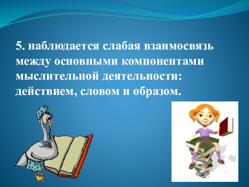 5. наблюдается слабая взаимосвязь между основными компонентами мыслительной деятельности: действием, словом и образом.